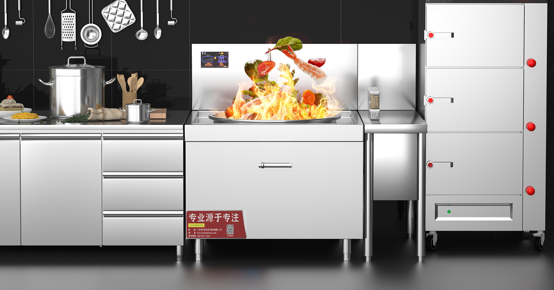 麥大廚廚房設(shè)備廠家研發(fā)、設(shè)計、生產(chǎn)、安裝和服務(wù)一站式解決。